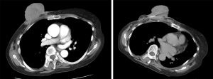 To further clarify the pathological diagnosis, the patient was admitted to our treatment center and underwent a CT-guided percutaneous puncture biopsy (Figure 2). Pathological results: invasive papillary carcinoma of the right breast, histological score: 3+2+1=6, moderately differentiated. Immunohistochemistry: estrogen receptor (ER, 90%+), progesterone receptor (PR, 0), human epidermal growth factor receptor 2 (HER-2, 0), P53 (wild type). The percentage of programmed cell death ligand 1 (PD-L1)-positive tumor cells: <1%.