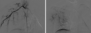 - Xu S, Li YM, Bie ZX, et al. Drug-eluting beads bronchial arterial chemoembolization/bronchial arterial infusion chemotherapy with and without PD-1 blockade for advanced non-small cell lung cancer: a comparative single-center cohort study. Quant Imaging Med Surg 2023;13:6241-56. [Crossref] [PubMed]