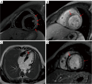 At 8 days after admission, serological examination and ECG indicated the possibility of myocardial injury or ischemia, so further cardiac magnetic resonance (CMR) plain scan + enhancement was performed, as shown in Figure 3. The main imaging findings were as follows: T2-weighted imaging (T2WI) lipid pressure sequence and T2 mapping indicated ventricular septum and anterior apex segment edema, first overperfusion of ventricular septum and anterior apex segment of myocardium in resting state, reduced subendocardial arc perfusion area, delayed scanning of ventricular septum and anterior apex segment of inferior endocardial high-line signal delayed enhancement, left heart function: left ventricular ejection fraction (LVEF) 54%, CO 4 L/min, end-diastolic volume (EDV) 112 mL, end-systolic volume (ESV) 51.8 mL. According to the characteristics of imaging findings, acute ischemic injury was confirmed.
