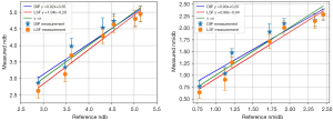 Figure 3 illustrates the regression plot depicting the correlation between the measured values and the literature values of ndb and nmidb for both the DIP method and the LSF method. The plot reveals a strong correlation, and the regression lines closely align with the reference plot of y=x. For the LSF method, the Pearson correlation coefficient between the measured values and the literature values is 0.98 (P=8.89e−5) for ndb and 0.98 (P=9.34e−5) for nmidb. The regression analysis yields a slope of 1.04 and an intercept of −0.29 for ndb and a slope of 0.98 and an intercept of −0.04 for nmidb. Similarly, the DIP method exhibits a reasonable correlation performance, with a Pearson correlation coefficient of 0.96 (P=0.0005) for ndb and 0.96 (P=0.0006) for nmidb. The regression analysis of DIP yields a slope of 0.92 and an intercept of 0.35 for ndb and a slope of 0.90 and an intercept of 0.20 for nmidb.
