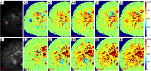 This study further demonstrated the practicality of DDVD in diagnosing liver simple cysts. Liver cysts typically show ‘no perfusion’ (Figures 4,7). However, such a ‘no perfusion’ was only observed when a very low second b-value was applied. When the second b-value is higher, for example, >30 s/mm2, liver cysts may lose their DDVD characteristics due to the contribution of T2. Note that liver cysts are likely to have a very long T2 being similar to that of gallbladder of 160 ms (53). When the second b-value is high, for example, 30 s/mm2, liver cyst may show even higher DDVD signal relative to the liver parenchyma (Figure 8). In addition, as noted earlier (14), the ‘position shift’ between the b=0 image and the second b-value image is a source of quantification error for DDVD calculation of structures inside the liver, as the liver is heavily subject to respiratory motion. One possible way to overcome this difficulty is to scan the DDVD protocol twice (or three) times, and manually select the pair of images with the most similar positions to reconstruct DDVD map. Breath-hold method DDVD data acquisition protocol may be indeed practically feasible (1).