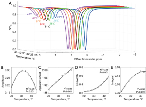 Repeatability of NMR experiment was assessed with phantom C0 {[Cr] =40 mM, pH =7.2, and temperature =37 ℃} on 3 different days. The apparent chemical offset of Cr was 1.984±0.003 ppm, representing the frequency difference between water and the guanidinium protons of Cr (Cr-Guan) () (Figure S1 and Table S1), which indicated a high repeatability and minimized variability. Temperature was linearly regressed with the apparent offsets of CrCEST peak () (R2=0.98, F=369.04, P<0.001) {Eq. [2]} (Figure 1), whereas the other CrCEST parameters (amplitude, linewidth, and integral) showed a complicated profile of temperature dependency. Concentration and pH of Cr phantoms imposed no significant effect on the apparent frequency offset of CrCEST peak (Figure 2), but obviously affected the amplitude, linewidth, and integral. The amplitude and integral of CrCEST peak increased with Cr concentration (temperature =37 ℃) (Figure S2). The amplitude, linewidth, and integral of CrCEST peak varied with the solution acidity in a non-linear manner (Figure S2).
