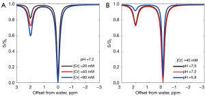 - Khlebnikov V, van der Kemp WJM, Hoogduin H, Klomp DWJ, Prompers JJ. Analysis of chemical exchange saturation transfer contributions from brain metabolites to the Z-spectra at various field strengths and pH. Sci Rep 2019;9:1089. [Crossref] [PubMed]