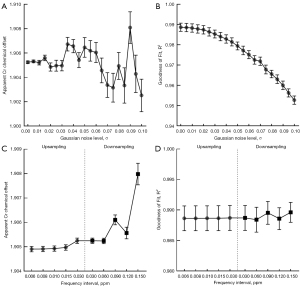 The effects of SNR level and spectral resolution on Z-spectra fitting and CrCEST offset measurement were assessed. With the noise level increasing, the goodness of Z-spectra fitting gradually declined, and the standard deviation of Cr chemical offset maps amplified but remained within 0.003 ppm, suggesting a temperature measurement error of less than 1 ℃ (Figure 4A,4B). Subsequently, down- and up-sampling of the raw Z-spectra were performed, resulting in different spectral resolutions ranging from 0.006 to 0.150 ppm. When the spectral resolution was larger than 0.120 ppm, the CrCEST offset significantly changed (Figure 4C), whereas the Z-spectra fitting was not affected by the spectral resolution (Figure 4D). These findings suggest that CrCEST-based thermometry would be beneficial from a high SNR level and spectral resolution. However, an acquisition with small frequency intervals would result in prolonged scan time and extra specific absorption rate (SAR). Thus, the acquisition with variable spectral intervals may serve as an alternative, setting a small step size around the Cr peak yet a large step size in other frequency ranges. This optimized acquisition method would not only ensure the sensitivity and accuracy of CrCEST signal quantification but also reduce scan time, enhancing the clinical applicability of CrCEST-based thermometry.