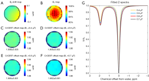 Furthermore, the CEST signal (S/S0) at −300 ppm of Cr phantom {[Cr] =80 mM and pH =6.6} was repeatably measured 30 times at 24.5 ℃ with the saturation time of 4 seconds and B1 of 0.6 µT. The signal variability was smaller than 1% (Figure S3), suggesting amplifier stability during the long-time CW CrCEST scan. Subsequently, the influence of B1 inhomogeneity on CrCEST was evaluated. The CrCEST scan of phantom (80 mM, pH =6.6, and 24.5 ℃) was repeated with four different B1 values (0.4, 0.5, 0.6, and 0.7 µT). The amplitude and linewidth of CrCEST peak increased with the saturation power augmentation, whereas the apparent chemical offsets were stable at 1.905±0.002 ppm (Figure 5), illustrating the negligible effect of B1 inhomogeneity on the measurement of the apparent CrCEST chemical offset. In addition, the B1 maps of Cr phantom obtained at different temperatures suggesting the homogeneity of B1 map did not vary significantly with the temperature (Figure S4).