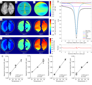 Chemical exchange saturation transfer (CEST) MRI is an emerging molecular imaging technique that enables the detection of low-concentration solute molecules via the water signal. Saturation of the labile solute protons is transferred to water protons through chemical exchange, the accumulative effect of which will eventually attenuate the water signal to a detectable scale, leading to higher detection sensitivity and signal-to-noise gain compared to the traditional 1H-MRS imaging (12-14). These advantages contribute to the outstanding metabolite detection capability of CEST, particularly under pathological conditions with decreased metabolite concentration. In addition, the temperature dependency of the CEST effects of endogenous labile protons may provide a mechanism for label-free brain thermometry (15). Rapid CEST imaging covering the whole brain is becoming available with the advancements of the acquisition and processing strategies (16,17), which will significantly promote the clinical applicability of CEST MRI as an alternative for the in vivo brain temperature mapping with enhanced sensitivity and high spatial resolution (18). This would have great implications for brain research, not only favoring the inference of brain physiology and pathology, but also allowing the monitoring of the treatment response with thermo-sensitive surgery or medicines (19).