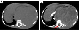 All 6 patients in the study underwent chest contrast-enhanced CT on a 64-slice spiral CT machine (Aquilion; Toshiba, Canon, Japan). The scanning parameters were set as follows: voltage at 120 kV, current ranging from 25 to 30 mAs, slice thickness of 0.8 mm, interslice gap of 1.8 mm, and matrix size of 512×512. Enhanced scanning was performed using a nonionic contrast agent (Ultravist 300; Bayer, Leverkusen, Germany) with a dosage of 2 mL/kg, slice thickness of 0.8 mm, interslice gap of 1.8 mm, and matrix size of 512×512. To induce sedation in noncompliant children, an oral administration of chloral hydrate (0.5 mL/kg) was given, and the scanning procedure was conducted while they slept.