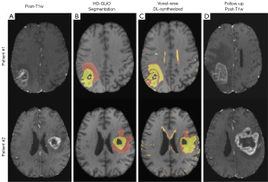 HD-GLIO is a DL segmentation tool (26-28) which uses three pre-contrast (pre-T1w, T2w, T2w-FLAIR) and one post-contrast (post-T1w) weighted images as inputs. It segments voxels with T1e, and voxels with T2h. We should highlight that this tool was trained with annotations performed by experts. In this work, GLIOMA and UPenn-GBM datasets were input to HD-GLIO for obtaining ground-truth segmentations.