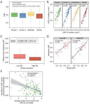 Furthermore, an additional external test set of 110 participants was used to assess the impact of our quality scoring system on the LVEF evaluation process conducted by human experts (Figure 7E). The absolute difference in LVEF assessments between the two doctors was calculated and found to be significantly negatively correlated with the image quality scores determined by our model. This correlation was quantified with a Pearson’s Correlation coefficient of −0.44, which falls within a 95% CI ranging from -0.58 to −0.28. Samples with higher quality scores exhibited a tendency towards smaller variations in LVEF assessments by the two doctors.