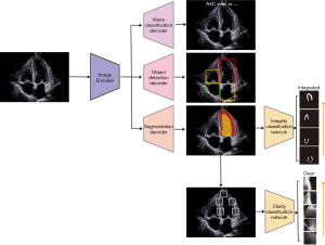 There have been reports on automatic echocardiographic quality assessment and computer-assisted LVEF calculation. The majority of these studies employ image-level classification strategies for echocardiographic quality assessment. Labs et al. reported a multi-classification model designed to assess the echocardiographic frames for tasks involving depth gain, chamber clarity, on-axis orientation, and foreshortening (6). Huang et al. developed a qualified scoring model based on the classification of echocardiography views, leveraging the capabilities of the DenseNet-121 convolutional neural network (8). Luong et al. constructed a clarity classification model for a series of temporal echocardiographic frames, utilizing a long short-term memory (LSTM) module in conjunction with a DenseNet convolutional neural network as the feature extraction backbone (5). These solutions are not well suited for real-time clinical quality assessment for echocardiography due to their large model size and computationally intensive calculations. Furthermore, another significant challenge lies in the “black box” problem associated with image-level DL classification methods, which further constrains their practical clinical application (15). In the majority of studies involving computer-assisted LVEF estimation, the preferred approach is the biplane Simpson’s method, which utilizes the cardiac chamber segmentation from both the A2C and A4C views. These studies have leveraged DL models to automate LV segmentation, subsequently applying Simpson’s formulas to assess LVEF (16-24). Additionally, several studies have designed a 4-level EF classifier on three-dimensional (3D) echocardiography (25) and 2D echocardiographic videos (26). To enhance robustness, Zhang et al. introduced an analytical framework that integrates view classification, cardiac chamber segmentation, and LVEF calculation (16). Similarly, Smistad et al. incorporated an apical foreshortening detection module into the LVEF calculation pipeline (19). However, none of these approaches possess the capability to conduct quality control before estimating LVEF.