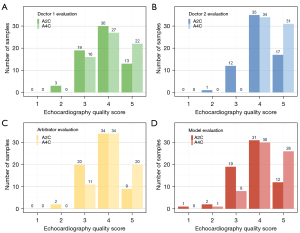 The 65 paired A2C and A4C echocardiograms were manually scored for quality and segmented for LV segment by two doctors, with arbitration by one arbitrator. Based on our 5-point quality scoring system, the distribution of samples as assessed by the two doctors and one arbitrator is illustrated in Figures 5A-5C, respectively. Additionally, Figure 5D displays the results of our automatic, real-time quality scoring model. In all assessments, the distribution of quality scores for the samples exhibited remarkable similarity: more than 95% of the samples received quality scores of 3 or higher, with half of the samples receiving a score of 4.