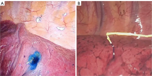 The design of the 4-hook anchor device provides more stable fixation and reduces the risk of intraoperative displacement. By increasing the number of anchoring points compared with the hook-wire technique, the 4-hook anchor device improves the accuracy and reliability of nodule localization. Our preceding randomized controlled trial (RCT) underscored the superior safety and efficacy of the 4-hook wire over the conventional hook-wire in the localization of pulmonary nodules (10). The methylene blue technique is favored for its simplicity and cost-effectiveness; however, it may exhibit dye diffusion in some cases, compromising the accuracy of surgical localization (12). The scarcity of comparative studies between the two localization methods is a significant gap that our research aimed to address.