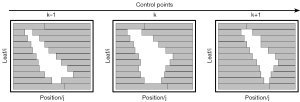 The MU parameters are numbers that can be directly processed by the learning model. However, the beam aperture is formed by a set of leaf positions and converted to a two-dimensional intensity map. As Figure 1 shows, the shape of a beam aperture at k-th CP can be represented by the i-th leaf index and j-th position index on a grid. The width of leaf is thinner (e.g., 0.25 mm) at the center and thicker (e.g., 0.50 mm) at the border. For consistency, the various leaf widths are interpolated to a single thickness or resolution (e.g., 0.1 mm). The resolution of the leaf position is mainly determined by the step size of the leaf motion.