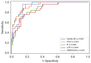 The ROC curves of the five models are compared in Figure 5. The performances of the Vanilla AE and PCA model were comparable and higher than the other models. The performance of the HDBSCAN model was slightly lower than the Vanilla AE and PCA model, but higher than the IF and LOF models. The AUC of the five models were all more than 0.86, which is high for model performance.