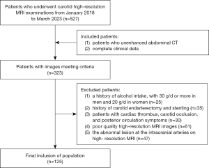 Patients with carotid plaque who underwent carotid high-resolution MRI examinations at Shandong Provincial Hospital between January 2018 and March 2023 were included in this study. To be eligible for inclusion in this study, the patients had to meet the following inclusion criteria: (I) have undergone an unenhanced abdominal computed tomography (CT) examination; and (II) have complete clinical data. Patients were excluded from the study if they met any of the following exclusion criteria: (I) had a history of alcohol intake of 30 g/d or more in men and 20 g/d in women; (II) had a history of carotid endarterectomy and stenting; (III) had cardiac thrombus, carotid occlusion, or posterior circulation symptoms; (IV) had poor-quality high-resolution MRI images; and/or (V) had an abnormal lesion at the intracranial arteries on high-resolution MRI. The study flow chart is shown in Figure 1.
