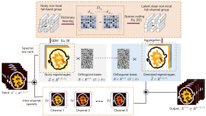 where and respectively denote the coefficient core tensor and the dimensional dictionary of the i-th tensor group . For each degraded full-channel group , once the coefficient core tensor and the dictionaries are obtained by solving Eq. [8], and the latent clean coefficient image group can be reconstructed as . After acquiring all coefficient image groups , the denoised coefficient image is obtained by placing the groups back in their original locations and averaging the overlapped pixels.