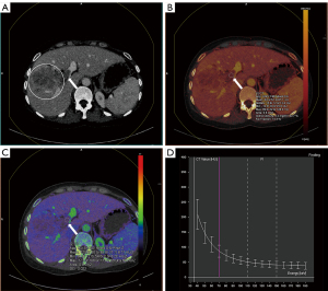 The average IC (mg/mL) was measured in the lesion, aorta, and normal portal vein using the “Liver-Virtual Non-Contrast (Liver-VNC)” mode. The NIC was calculated to minimize the effects of physiological variations among individuals with NIC-A defined as the ratio of IC in the lesion to that in the aorta (NIC-A = IC_lesion/IC_aorta) and NIC-V as the ratio of IC in the lesion to that in the portal vein (NIC-V = IC_lesion/IC_portal vein). The electron density (Rho), Z, and DEI values for lesion were derived using the “Rho/Z” mode. Another quantitative parameter utilized in the dual-energy analysis is the K, which was calculated using the formula [K = (CT40 KeV − CT100 keV)/60], where CT represents the attenuation values at monochromatic energy levels of 40 and 100 keV, respectively. All measurements were performed three times, and the average values were used for further analysis.