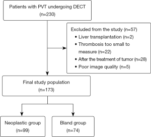 However, research on the use of DECT quantitative parameters to differentiate between bland and neoplastic PVT is restricted, with only preliminary studies on IC having been conducted by Qian et al. (19) and Ascenti et al. (20). Hence, this study was conducted to evaluate the viability and diagnostic utility of DECT quantitative parameters in differentiating neoplastic from bland thrombus. We present this article in accordance with the STARD reporting checklist (available at https://qims.amegroups.com/article/view/10.21037/qims-2024-2516/rc).