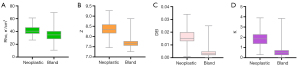 The analysis of PVT parameters demonstrated a high level of interobserver agreement, with the ICC exceeding 0.9 for the measurements of IC, NIC-A, NIC-V, Rho, Z, DEI, and K by two radiologists. The DECT parameters of neoplastic and bland PVTs are summarized in Table 2. The values of IC, NIC-A, and NIC-V were significantly higher in neoplastic PVTs compared to bland PVTs (P<0.001; Figure 2). Additionally, Rho, Z, DEI, and K were also significantly higher in neoplastic PVTs compared to bland PVTs (P<0.001; Figure 3).