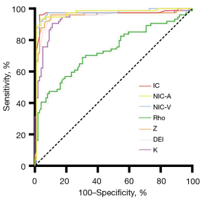 AUC, area under the curve; DECT, dual-energy computed tomography; DEI, dual-energy index; IC, iodine concentration; K, spectral slope; NIC-A, normalized iodine concentration in the aorta; NIC-V, normalized iodine concentration in the portal vein; PVT, portal vein thrombosis; Rho, electron density; Z, effective atomic number.