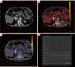 In recent years, dual-energy computed tomography (DECT) has gained widespread acceptance as an advanced diagnostic technique. It utilizes two sets of X-ray tubes and detectors to distinguish tissues based on their attenuation characteristics at different X-ray energies, offering superior diagnostic capabilities compared to traditional CT (13). DECT can improve image quality, reduce beam-hardening, and provide quantitative parameters such as iodine concentration (IC), normalized iodine concentration (NIC), effective atomic number (Z), dual-energy index (DEI), and spectral slope (K), which are valuable for disease diagnosis, differentiation, therapeutic evaluation, and prognostic assessment (14,15). Researchers have successfully utilized DECT quantitative parameters to detect and assess tumor lesions, demonstrating promising results (16-18). Thus, based on the different mechanisms and constituent components of PVTT and bland PVT, estimation of the quantitative parameter differences using DECT may be able to distinguish them, which holds crucial clinical value for choosing treatment, forecasting survival, and assessing PVTT activity post-treatment.