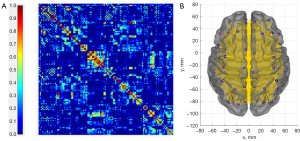 There are various methods for analyzing resting-state images, including seed-based, independent component analysis (ICA), graph, clustering algorithms, neural networks, and pattern classification. Since the aim of the present study is to analyze rest-state functional connectivity across all brain regions, the graph method is used. Each graph network G is shown as G = (N, K), where N represents the number of nodes, encapsulating the brain regions under study, while K signifies the number of edges in the graph, symbolizing the connections between these nodes. Using the brain network and the constructed connection matrix, graph analysis can be performed by using BRAGH software (17). The graph made of the whole brain is shown in Figure 2B.