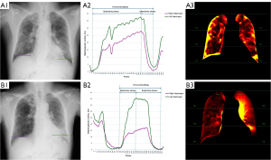 - Yamada Y, Ueyama M, Abe T, Araki T, Abe T, Nishino M, Jinzaki M, Hatabu H, Kudoh S. Time-Resolved Quantitative Analysis of the Diaphragms During Tidal Breathing in a Standing Position Using Dynamic Chest Radiography with a Flat Panel Detector System (“Dynamic X-Ray Phrenicography”): Initial Experience in 172 Volunteers. Acad Radiol 2017;24:393-400. [Crossref] [PubMed]