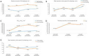 The patient’s symptoms improved significantly after left SLT. The patient was dismissed from mechanical ventilation and oxygen supplementation. Follow-up DCR was performed at 1-, 2-, and 6-month (Figure 1, B1-B3; Video S2). The DCR-derived parameters at different timepoints, including a maximum excursion of the diaphragm, mean expiratory motion speed of the diaphragm, maximum projected lung area−minimum projected lung area (PLAmax−PLAmin), and percentage of lung blood flow on the transplanted side were higher than those before the transplant (Figure 2A-2D). The mean inspiratory motion speed of the diaphragm on the transplanted side was lower than that before the transplant (Figure 2E). The maximum diaphragm excursion, the PLAmax−PLAmin, the total percent of pulmonary blood flow, and the diaphragm inspiratory motion speed on the native side were lower than those pre-transplantation. The mean diaphragm expiratory motion speed on the native side was higher than pre-transplantation during forced breathing (Figure S1).