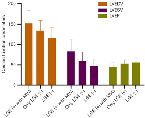 The participants were divided into three groups according to the LGE results, namely LGE (−), LGE (+) without MVO, and LGE (+) with MVO. Baseline demographics, clinical characteristics, and cardiac function of patients are summarized in Table 2. Cardiac function parameters were statistically different between the three patient groups, including LVEDV, LVESV, and LVEF (Figure 2).