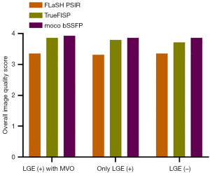 The overall IQ scores of the FLASH PSIR, moco bSSFP, and TrueFISP PSIR for all patients were 3.45 (3.07, 3.64), 3.89 (3.8, 3.91), and 3.91 (3.82, 4), respectively. The overall IQ score for moco bSSFP and TrueFISP PSIR was significantly higher than turbo FLASH (P<0.001). The overall IQ score of moco bSSFP was significantly higher than that of TrueFISP PSIR (P<0.001). The LGE image of a typical patient is illustrated in Figure 3. To further investigate the differences in overall IQ scores of the three LGE sequences between the three groups, we performed a subgroup analysis. The same results were finally obtained, as detailed in Figure 4.