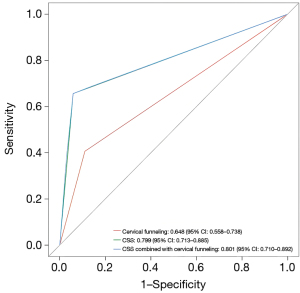 In predicting preterm labor, the AUC for CSS was greater than that for funneling (0.799 vs. 0.648; P=0.001), and the AUC for CSS combined with cervical funneling was significantly greater than that for funneling (0.801 vs. 0.648; P<0.001). However, there was no statistically significant difference between AUCs of CSS alone and CSS combined with funneling (0.799 vs. 0.801; P=0.89) (Table 5).