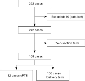 The exclusion criteria were as follows: smoking habit, a history of cervical conization, fetal congenital or structural abnormalities, iatrogenic preterm birth due to placenta previa, placental abruption, previous cervical surgery, single fetal demise, uterine contractions and/or cervical dilatation, a history of preterm labor at the time of examination, uterine anomalies and multiple pregnancies, polyhydramnios, and oligohydramnios.