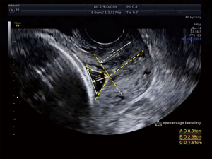 Cervical funneling was considered present when sonography showed ballooning of the membranes into a dilated internal os with a closed external os and protrusions of at least 15% of the entire CL (23,24) (Figure 4).