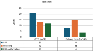 The proportion of CSS positivity was higher in the sPTB group, while that of funnel sign was higher in the term birth group (65.62% and 11.36%, respectively) (Figure 5).