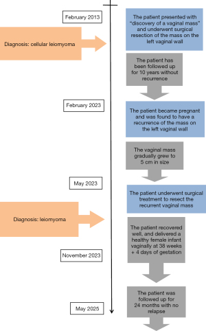 A 32-year-old pregnant woman was admitted to West China Second University Hospital due to a vaginal mass. The patient had a resection of a vaginal mass 10 years previously, which was pathologically diagnosed as a highly cellular leiomyoma. She had no recurrence during the 10 years of follow-up. Fourteen weeks previously, she became pregnant and noticed a gradually developing mass on the same side of the vagina. Physical examination revealed a mass measuring 6 cm × 6 cm × 5 cm in size at the vaginal orifice, originating from the left vaginal wall (Figure 1A,1B). Ultrasound imaging suggested an intrauterine pregnancy and a vaginal mass approximately 5 cm in size (Figure 2A,2B). There was no leiomyoma in the uterus. Surgical intervention was indicated due to a progressively growing vaginal mass of undetermined nature during pregnancy, which was obstructing the vaginal orifice, potentially impeding the birth canal and affecting labor progression. A resection of the vaginal mass was performed under general anesthesia. The mass was located beneath the left vaginal mucosa near the orifice, with a clear boundary suggestive of a leiomyoma. The procedure began with an incision in the vaginal mucosa (Figure 3A). Scissors were then used to carefully separate the mass from the vaginal wall (Figure 3B). An ultrasound knife was employed to cut the vessels supplying the mass. (Figure 3C,3D). The mass was completely resected, and the wound surface showed no obvious bleeding (Figure 3E). Finally, the vaginal mucosa was sutured with absorbable stitches (Figure 3F). The appearance of the vaginal area returned to normal (Figure 4A), and the mass had a smooth surface resembling a leiomyoma (Figure 4B,4C). Pathological results confirmed the diagnosis of leiomyoma with degeneration. After the operation, the patient recovered well and showed no signs of impending abortion. She successfully gave birth to a healthy baby girl vaginally at 38+4 gestational weeks. The patient showed no signs of recurrence during the 24-month follow-up period. A detailed timeline outlining the patient’s clinical course is presented in Figure 5. All procedures performed in this study were in accordance with the ethical standards of the institutional and/or national research committee(s), and with the Declaration of Helsinki and its subsequent amendments. Written informed consent was obtained from the patient for publication of this article and accompanying images. A copy of the written consent is available for review by the editorial office of this journal.
