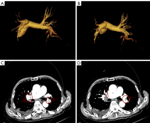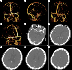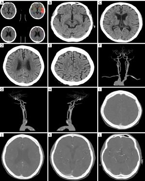 Laboratory tests revealed a white blood cell count of 14.3×109/L, of which, eosinophils accounted for 47.4% (absolute value: 6.76×109/L), and a platelet count of 64×109/L. An emergency triple head computed tomography (CT) [plain scan + computed tomography angiography (CTA) + computed tomography perfusion (CTP)] ruled out hemorrhage and major vascular lesions (Figures 1,2). Upon admission, the patient reported a 15-hour history of symptoms, exceeding the standard 4.5-hour time window for intravenous thrombolysis (IVT) as per the American Heart Association/American Stroke Association guidelines (13). Additionally, the laboratory results revealed a platelet count of 64×109/L, which further contraindicated IVT due to an increased risk of bleeding. Head CTA and CTP excluded large-vessel occlusion, and thrombocytopenia necessitated cautious anticoagulation strategies over thrombolytic therapy.