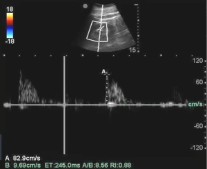 For RRI measurement (11), intrarenal vessels were located on the coronal plane of the kidney. Blood flow velocity was measured for two to three arteries of each kidney, with three continuous velocity waveforms obtained for each artery. The median value was taken as the resistance index of each artery, and the median resistance index of multiple arteries was considered the resistance index of each kidney (Figure 2).