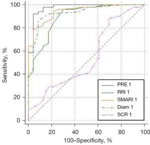 The combined evaluation of RRI, SMARI, Diam, and SCR has statistically significant difference compared with single parameter evaluation at the 24th hour, except the SMARI. *, statistically significant. 1, the check at the 24th hour; AUC, area under the curve; CI, confidence interval; Diam, colonic diameter; ROC, receiver operating characteristic; PRE, predictive model; RRI, renal artery resistance index; SCR, serum creatinine; SMARI, superior mesenteric artery resistance index.