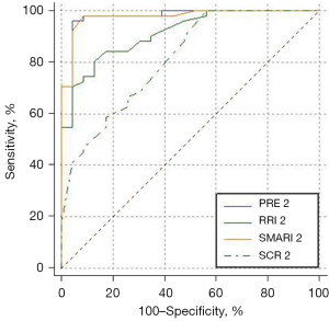 Pairwise comparisons of ROC curves showed that the combined predictive model (PRE) had significantly higher AUC compared to individual parameters, except for SMARI, which showed no significant difference from the combined model.