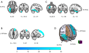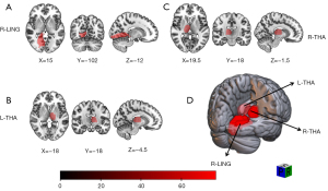 Compared with HCs, patients with AAD demonstrated significantly reduced GMV in the right FFG, right parahippocampal gyrus (PHG), and left superior frontal gyrus (Table 2; Figure 1). Conversely, increased GMV was observed in the right lingual gyrus and bilateral thalamus of patients with AAD (Table 2; Figure 2).