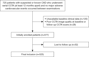 This retrospective, single-center, observational study was performed at our institution. Patients with suspected or known CAD who had baseline CCTA between January 2010 and December 2013 and serial CCTA before September 2020 were included in the study. The inclusion criteria were as follows: (I) interscan interval for serial CCTA scans >12 months and (II) no MACE occurred between the serial CCTA scans. The exclusion criteria were as follows: (I) unavailable baseline clinical data; (II) poor CCTA image quality at baseline or follow-up CCTA scans; and (III) lost to follow up. The demographics and clinical characteristics of the patients were obtained from the medical records or gathered via phone call. The study was conducted in accordance with the Declaration of Helsinki and its subsequent amendments. The study was approved by the Ethics Committee of Fuwai Hospital (No. 2022-1870) and individual consent for this retrospective analysis was waived.