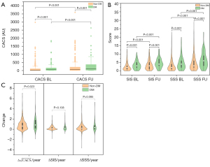 At follow-up CCTA, SIS, SSS, and CACS were significantly different between the DM and non-DM groups [SIS: 4 (3–7) vs. 3 (1–5), P<0.001; SSS: 6 (3–9) vs. 3 (2–6), P<0.001; CACS: 113 (21–371) vs. 53 (5–213) AU, P=0.001]. The DM group had more patients with CAD-RADS 4–5 (31.3% vs. 19.0%, P=0.005), two-vessel involvement (19.1% vs. 11.0%, P=0.021) and high-risk plaque (23.5% vs. 8.3%, P<0.001). The difference in ∆SIS/year [0.23 (0.00–0.55) vs. 0.15 (0.00–0.42)] in the DM and non-DM groups as well as ∆SSS/year [0.32 (0.00–0.77) vs. 0.22 (0.00–0.62)] in both groups did not reach statistical significance (P>0.05), whereas the /year was higher in the DM group than in the non-DM group [0.85 (0.20–1.79) vs. 0.64 (0.00–1.25), P=0.023].
