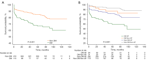 This study initially enrolled 577 patients, and 525 (91.0%) patients could be successfully followed up (Figure 1). The demographics and clinical characteristics of these patients are shown in Table 1, stratified by the presence of DM. The median patient age was 56 (49–63) years, and 355 (67.6%) of them were men. There were 115 patients in the DM group and 410 patients in the non-DM group. The median age of the DM group was 56 (50–65) years, and 71 (61.7%) patients in this group were men. The median age of the non-DM group was 56 (49–63) years, and 284 (69.3%) patients in this group were men. The DM group was comparable to the non-DM group in terms of male sex, age, BMI, hypertension, hyperlipidemia, family history of CAD, and history of smoking (P>0.05 for all). The interscan period between baseline and follow-up CCTA was not different between DM and non-DM groups (38 vs. 45 months, P=0.058). The follow-up period was 69 (43–95) months after follow-up CCTA and 121 (106–134) months after baseline CCTA.