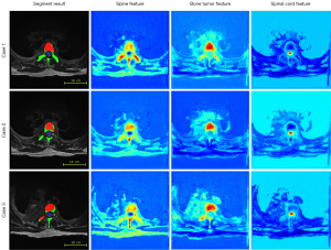 In order to observe the multi-target feature recognition, we added a feature visualization output module before the final classification softmax output layer of the network. This module transforms the features of different classification targets into grayscale [0–255] and then applies a color map to generate a heatmap. Figure 6 displays the feature heatmap distributions for different segmentation targets: the first column shows the segment result, the second column shows the spine, the third column shows the tumor, and the fourth column shows the spinal cord. In these heatmaps, the areas with darker red colors represent stronger or more prominent features, while the yellow regions indicate features with moderate intensity.