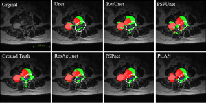 The segmentation of the spine, spinal cord, bone tumors, and background in target images directly affects the extraction of target features and classification performance. To evaluate the segmentation capability of the PCAN, we compared its segmentation results with other traditional methods, as detailed in Table 1.