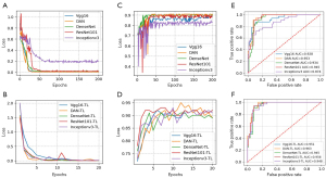 Figure 9C shows the validation set accuracy of different networks at different training epochs. Figure 9D shows the validation set accuracy of different networks at different training epochs using the fine-tuning TL method. The results show that through TL, the target network achieves better classification performance with fewer training epochs, and also achieves a certain degree of improvement in classification accuracy. Figure 9E,9F present the ROC curves and corresponding AUC values of different networks, both without and with TL (non-TL and TL). The ROC curve and AUC provide a more robust evaluation of model performance compared to single-threshold metrics. Among non-TL models, DAN achieves the highest AUC value of 0.953, followed by ResNet101. In the TL setting, DAN-TL also attains the best performance with an AUC of 0.963.