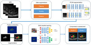 - We have proposed a novel progressive compression grading assessment method, which is different from the traditional method of direct classification with multiple MRI slices. First, multi-tissue feature segmentation was performed through PCAN to help clinicians quickly identify the positional relationship between tumor tissue and spinal cord. Second, based on the multi-tissue features identified by PCAN, DAN was used to perform an automated grading evaluation of compression. It provides clinicians with more objective and efficient evaluation indicators.