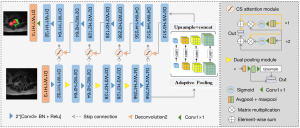 Unet (35) was first proposed at the Medical Image Computing and Computer-Assisted Intervention (MICCAI) conference in 2015 and achieved exciting results in biomedical image segmentation. Subsequently, the U-shaped segmentation network was widely used in the field of medical image segmentation (36,37). Based on the encoding-decoding U-shaped network framework (38), we proposed a pyramid multi-scale pooling and PCAN to address the morphological variability and blurred boundary of metastatic tumor MRI (Figure 2). First, the encoding compression part is improved by replacing the original max-pooling downsampling with dual-pooling downsampling. Then, at the bottom of the encoder, a pyramid pooling module (PPM) is employed to filter and fuse multi-level, multi-scale features of the compressed representations, thereby enhancing the network’s receptive field across multiple dimensions. Finally, in the skip connection section, a cross-attention module is introduced to enhance the cross-attention between the encoded and decoded features, improving the overall target recognition capability of the network.