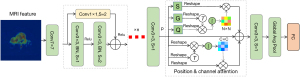 The position attention module is used to fuse the cross-spatial information of different local feature maps. There are two convolution layers after input features P for horizontal and vertical filtering to enhance the spatial location recognition. And then reshape and transpose to generate two new feature maps G and feature matrix Q. The spatial weight feature matrix is obtained by matrix multiplication and softmax operation for features G and Q, the formula is as follows.