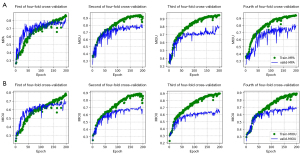 The performance of the proposed method was validated with the private clinical dataset. Due to the limited dataset, which are only 88 cases and 577 MRI slices. We used the four-fold cross-validation method to enhance the effectiveness of the validation. Every fold has 22 cases. First, we used the four-fold cross-validation method to select the optimal network of evaluation parameters. Second, TL was used to train all datasets to improve the overall segmentation and recognition ability of the network. Figure 4 shows the mean pixel accuracy (MPA) and mean intersection over union (MIOU) curves in different training epochs of four-fold cross-validation training.